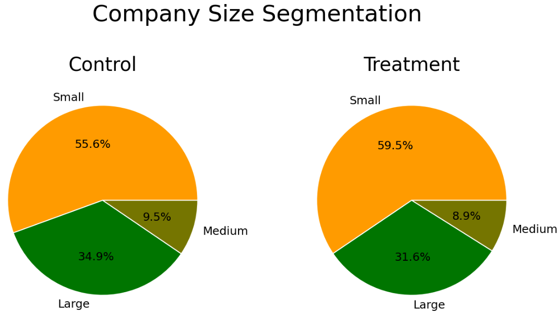 We see that certain advertisers in the treatment group (the small companies) are entering a lower budget, wary of the new product (Fig. 8). The reduction in small companies’ budget is likely not due to random fluctuations as evidenced by the low p-value of 0.007. However, the new product has a neutral effect on medium and large companies’ budgets. On aggregate, the treatment group’s budget is greater than or equal to the control group.
