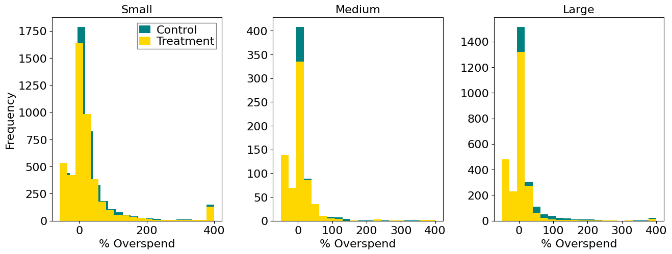 Welch’s t-test was performed on the % overspend of all company segments. The effectiveness of the treatment can be inferred from both the p-value and the test statistic, as seen in Fig. 6. We can safely say that, on aggregate, the new product is effective in reducing overspend. This holds true for large and small companies, separately. However, it failed to reduce overspending for the medium companies.
