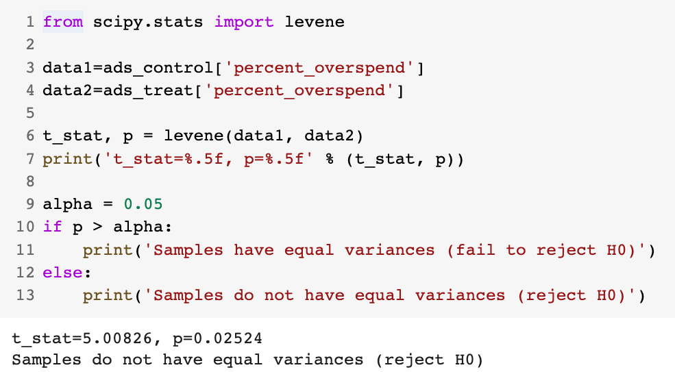 We may use a two-sample, one-sided t-test to see if the percentage overspend decreases in the treatment group, which is defined as the success of our experiment.