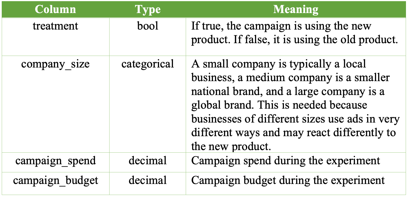 We randomly split the advertisers on the platform. Half of the advertisers remained on the old product and the other half received the new product. A week later, we collect the data and want to determine whether or not the experiment was a success. Let us look at the data schema and start the analysis.