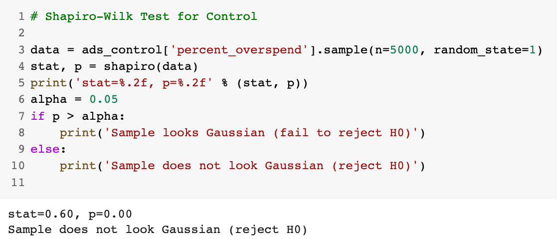 Readers of the Black Swan by Nassim Taleb might see the importance of this step by reflecting on the disasters of assuming a Gaussian distribution for any population and getting surprised by rare events. We do not expect to have repercussions like that in our analysis, however, it is a necessary practice to check for the normality of our population nevertheless. A histogram of the two group samples (Fig. 3) signals the non-normality of the data. This can be checked using the Shapiro-Wilk test for both groups - we choose not to segment the data as they exhibit similar skewness.