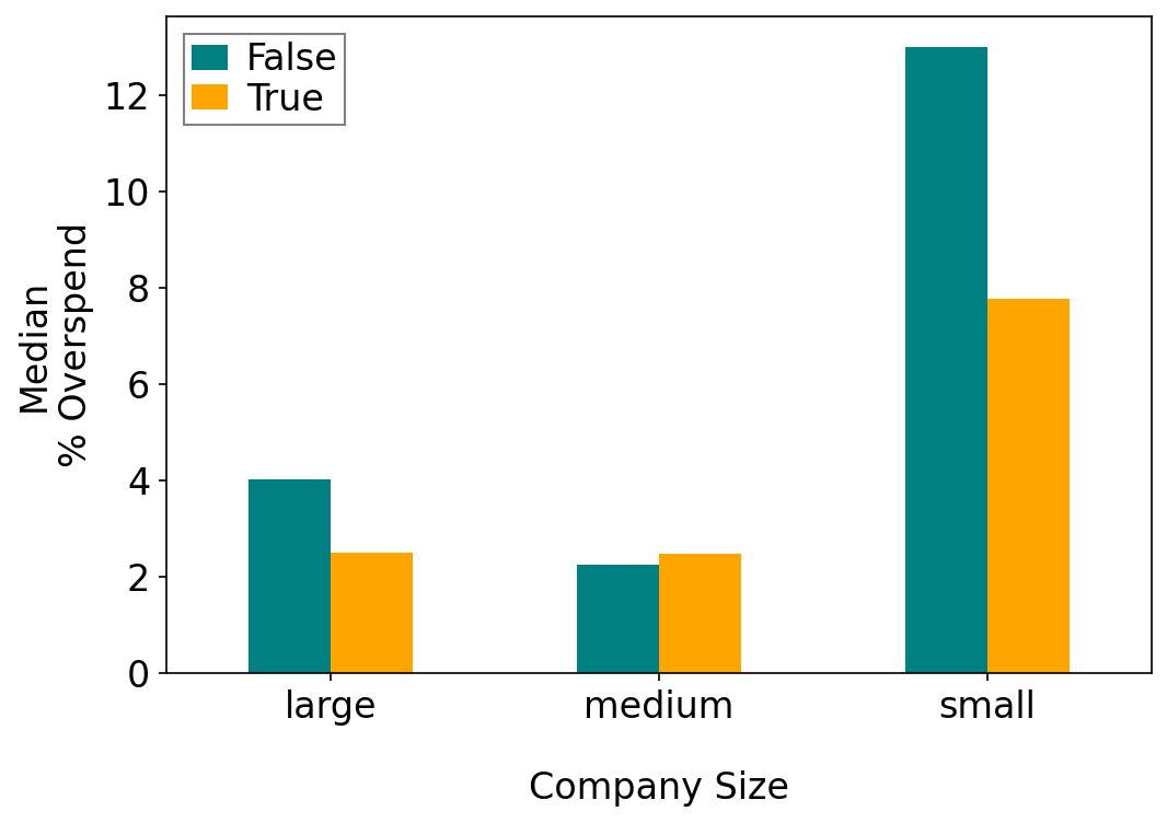 This, however, doesn’t mean that the revenue follows the same trend because small companies have lower budgets. A simple aggregation of data by finding the median of percentage overspending shows that the overspending decreases considerably in both small and large companies, but increases slightly in medium companies (Fig. 2).